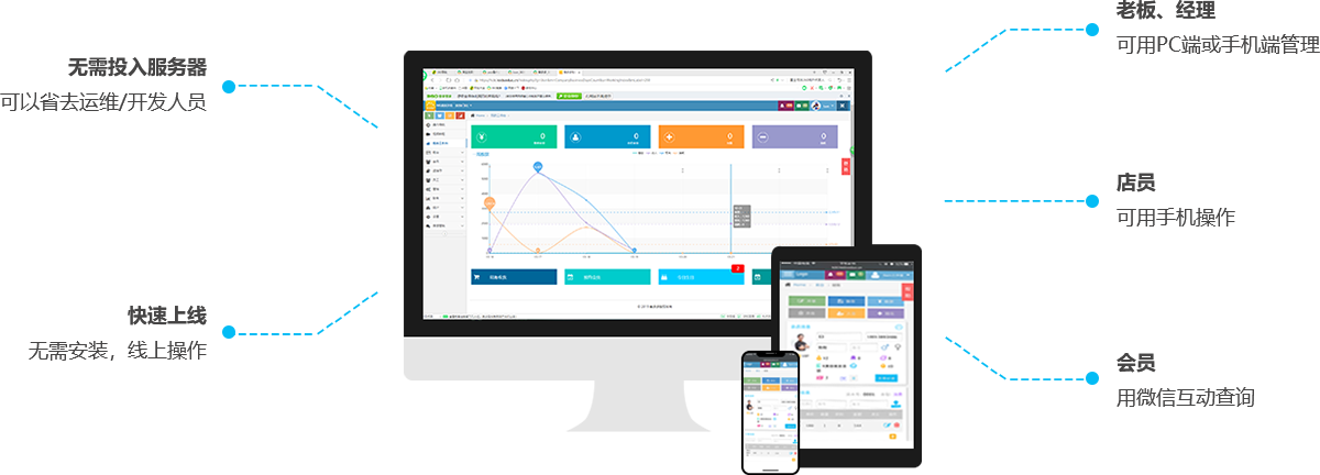 線下充值,線上消費(fèi)。線下積分,線上兌換。一個(gè)后臺(tái),總覽線上線下運(yùn)營(yíng)情況。